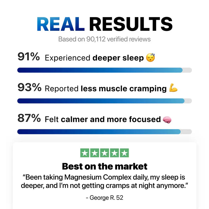 Our Magnesium Complex contains high-bioavailability forms your body absorbs easily, without the digestive discomfort common with cheap magnesium oxide. Manufactured in a GMP-certified facility, third-party tested, and trusted by thousands — it’s a safe, daily way to support your overall wellness.